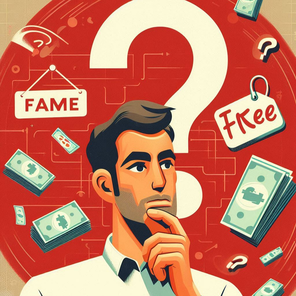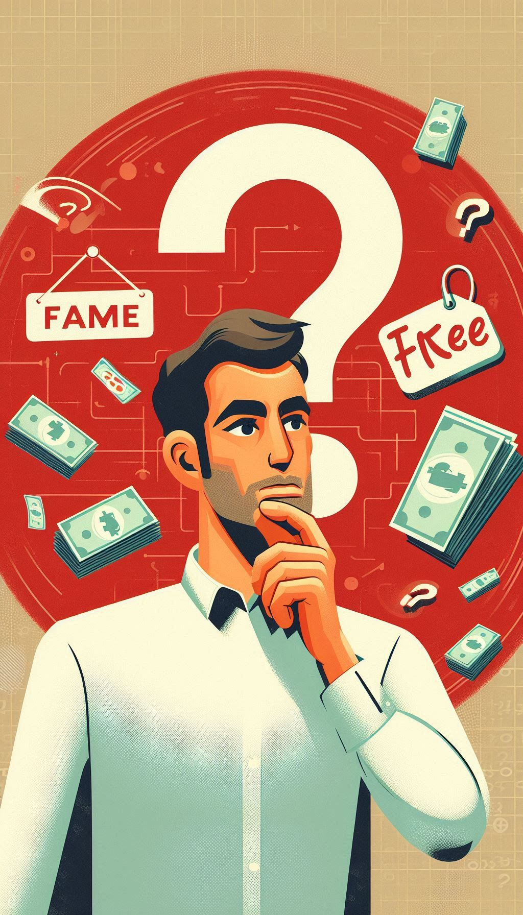 A pensive man standing in front of a question mark. Surrounding the question mark are dollar bills and the words "fame" and "free."